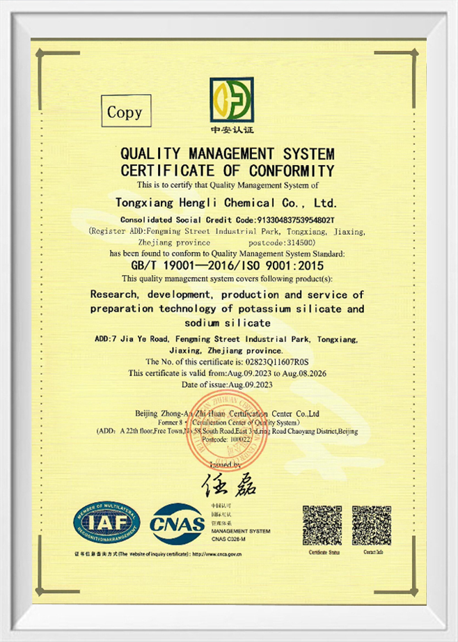 পরিবেশগতভাবে বন্ধুত্বপূর্ণ আবরণ হিসাবে, সাম্প্রতিক বছরগুলিতে জল-ভিত্তিক আবরণগুলির বাজারের চাহিদা বৃদ্ধি অব্যাহত রয়েছে। 4.8-5.0 মডুলাস সহ পটাসিয়াম সিলিকেট জল-ভিত্তিক আবরণগুলির কর্মক্ষমতা উন্নতির জন্য শক্তিশালী সমর্থন প্রদান করে। Tongxiang Hengli Chemical Co., Ltd. এই পণ্যটিকে জল-ভিত্তিক আবরণের গবেষণা ও উন্নয়ন এবং উৎপাদনে প্রয়োগ করে এবং এর ভাল ফিল্ম-গঠনের বৈশিষ্ট্য এবং জল প্রতিরোধের ব্যবহার করে জল-ভিত্তিক আবরণগুলির গুণমান উন্নত করে৷ এই পটাসিয়াম সিলিকেট জল-ভিত্তিক আবরণের অন্যান্য উপাদানগুলির সাথে একটি অভিন্ন আবরণ তৈরি করতে পারে, যা আবরণটিকে আরও ভাল লুকানোর শক্তি এবং গ্লস দেয়। একই সময়ে, এর চমৎকার জল প্রতিরোধ ক্ষমতা জল-ভিত্তিক পেইন্টকে আর্দ্র পরিবেশে ভাল কার্যক্ষমতা বজায় রাখতে দেয় এবং এটি খোসা ছাড়ানো বা পড়ে যাওয়া সহজ নয়, যা জল-ভিত্তিক পেইন্টের প্রয়োগের পরিসরকে বিস্তৃত করে। এটি অভ্যন্তরীণ সজ্জা বা বহিরঙ্গন নির্মাণ হোক না কেন, 4.8-5.0 মডুলাস সহ পটাসিয়াম সিলিকেটযুক্ত জল-ভিত্তিক পেইন্টের ব্যবহার আদর্শ আলংকারিক এবং প্রতিরক্ষামূলক প্রভাব অর্জন করতে পারে। আমি